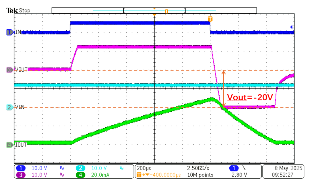 –在同工况下,ONXQ000 内置的负压保护电路,可将输出电压稳定钳位在-20V左右(如下图所示),以减小对芯片的冲击。