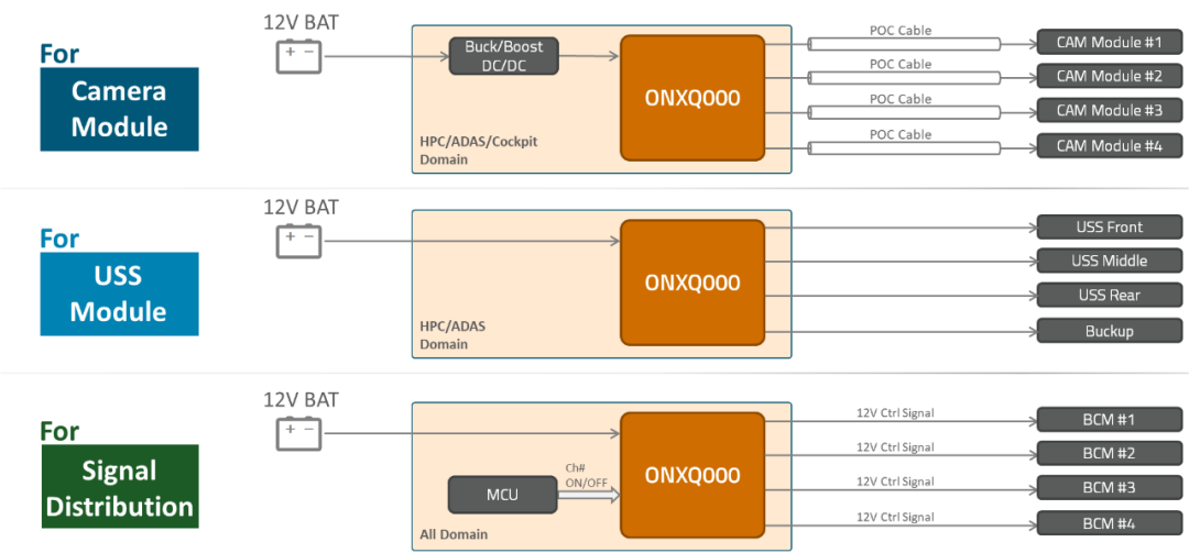 ONXQ000主要应用场景为智能座舱域控制器,智能驾驶域控制器及车身ZCU,可为摄像头、超声波雷达及童锁灯、迎宾灯、氛围灯等小功率设备提供供电和保护功能。