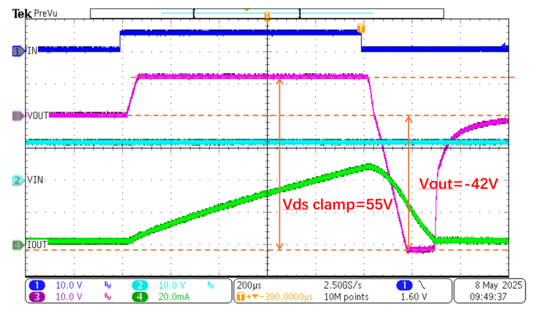 –不带有此功能的产品,只能依靠开关管的漏源钳位保护电路,在12V的工况下,输出负压低于-40V时才能触发Vds钳位保护 (如下图所示)。