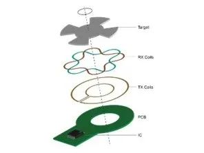 感应传感器基于电磁感应工作,并使用 PCB 走线代替线圈绕组。传感元件包括一个传输线圈、两个接收线圈、一个 IC 和一个旋转金属靶(如图 6 所示)。通过将外部电容器连接到传输线圈形成 LC 谐振电路,IC 以特定频率激活传输线圈。靶材产生涡流,形成电磁场,在接收线圈中感应出电动势。正弦接收线圈调制感应信号,而另一个(偏置 90°)次级线圈承载余弦信号。IC 使用反正切法计算角度。感应传感器在温度变化、振动和外部磁场下表现良好。此外,它们可以以比旋转变压器更低的成本集成到更小的空间中。
