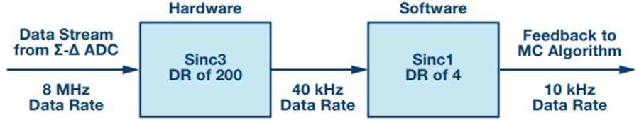 滤波技术可以与分离反馈路径方法一起使用。由于硬件和软件sinc滤波器组合提供非常高的衰减,但会给电流反馈带来一定的延迟,因此滤波技术最适合于I路径。