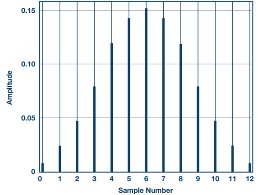 其中,y为输出序列,x为输入序列,h为系统脉冲响应。sinc滤波器是一个线性且不随时间变化的系统,因此脉冲响应h[n]可用来确定任何时间对任何输入的响应。举个例子,图4显示了一个抽取率为5的三阶sinc滤波器的脉冲响应。