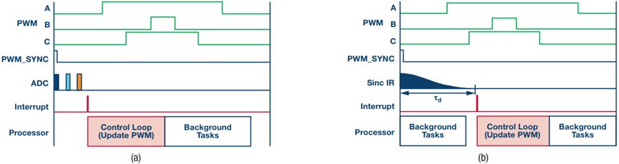 在SAR情形(a)中,PWM_SYNC脉冲触发ADC执行若干采样和转换。当数据对控制环路而言已就绪时,系统产生一个中断,控制环路便可开始执行。而在Σ-Δ情形中,不是等待ADC,而是要让数据完全通过sinc滤波器。当数据就绪时,系统产生一个中断,指示控制环路可以执行。如果进行类比的话,SAR ADC的转换时间相当于脉冲响应时间的一半。脉冲响应一半的具体长度取决于调制时钟和抽取率。对于fM = 20 MHz且DR = 100的典型配置,脉冲响应的一半为τd = 7.4 μs。虽然比快速SAR ADC略长,但数值差别不大。