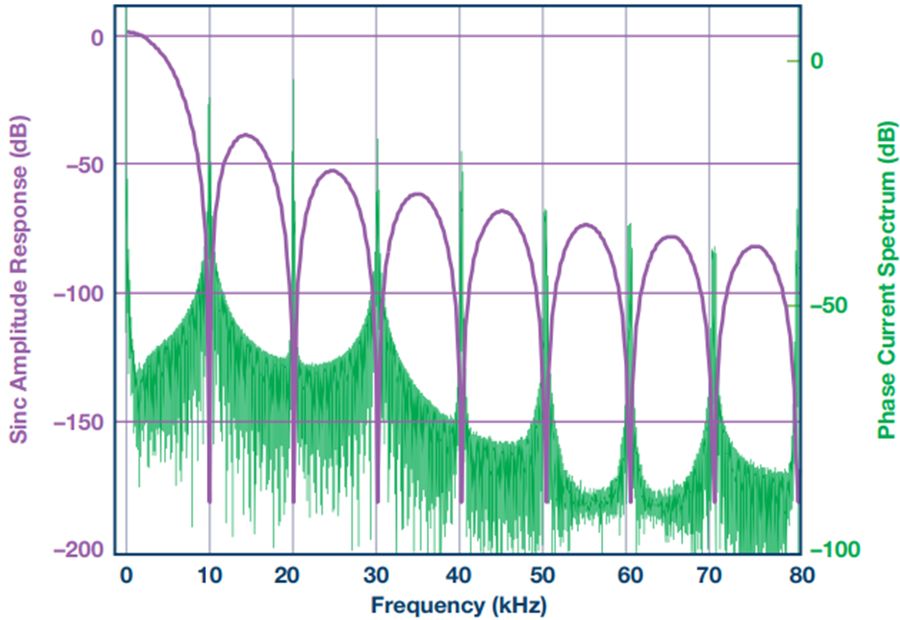 如果陷波频率与相电流频谱的边带相同,就能非常有效地衰减逆变器开关噪声。举个例子,考虑逆变器开关频率fsw为 10 kHz,ADC调制器时钟fM为8 MHz,抽取率DR为800。这样,陷波频率为n × 10 kHz,响应如图10所示。注意每个边带是如何被陷波衰减的。