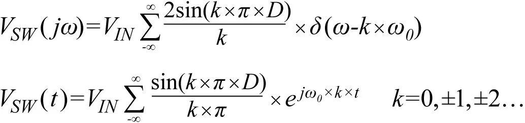 图1所示为典型的降压稳压器。两个开关交替接通和断开,因此SW节点电压VSW是一个理想的方波,此特性进而传递到占空比和输入电压。VSWVSW可以用下面的公式表示:
