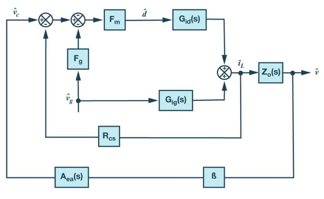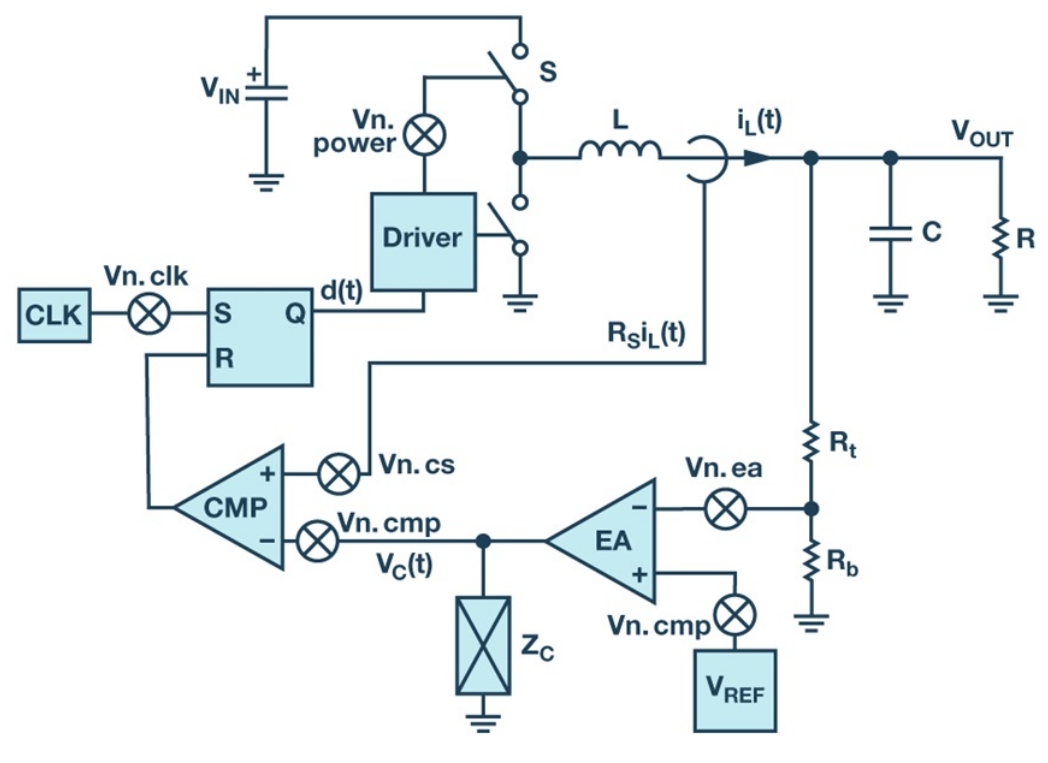 为了识别和分析开关稳压器输出宽带噪声,必须获得稳压器控制方案和模块噪声信息。例如,图6显示了典型的电流模式降压稳压器控制方案和模块噪声源注入。