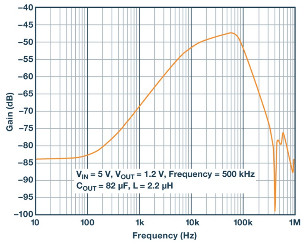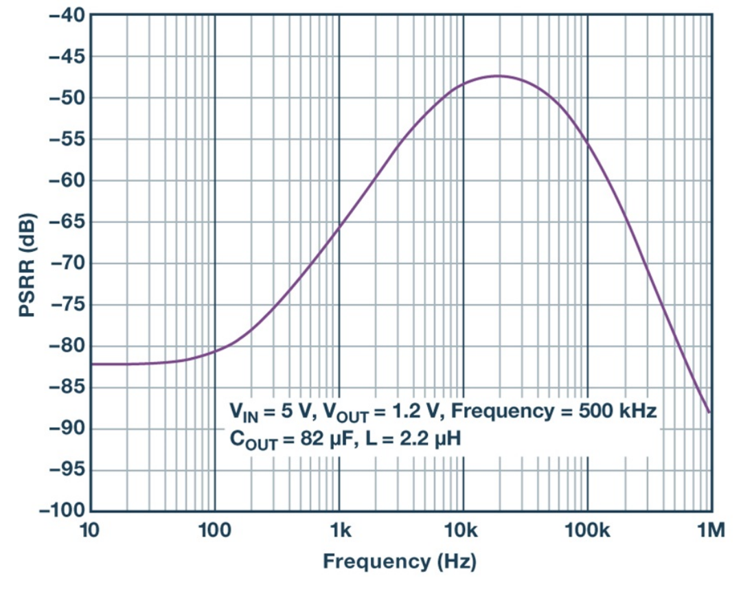 开关稳压器的PSRR性能取决于低频范围内的环路增益性能。开关稳压器的固有LC滤波器可以抑制中频范围(100Hz至10MHz)内的输入噪声。此范围内的抑制性能比LDO PSRR好得多。因此,开关稳压器具有理想的PSRR性能,因为其在低频时具有高环路增益,而固有LC滤波器会影响中频范围。