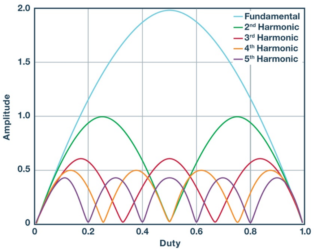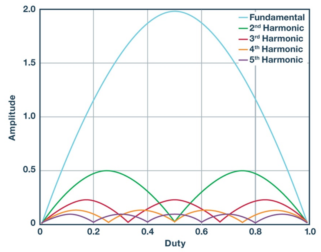 VIN 确定后,VSW基波和谐波成分仅取决于占空比。图2显示了与占空比相关的 VSW基波和谐波幅度。当占空比接近一半时,纹波幅度以基波为主。