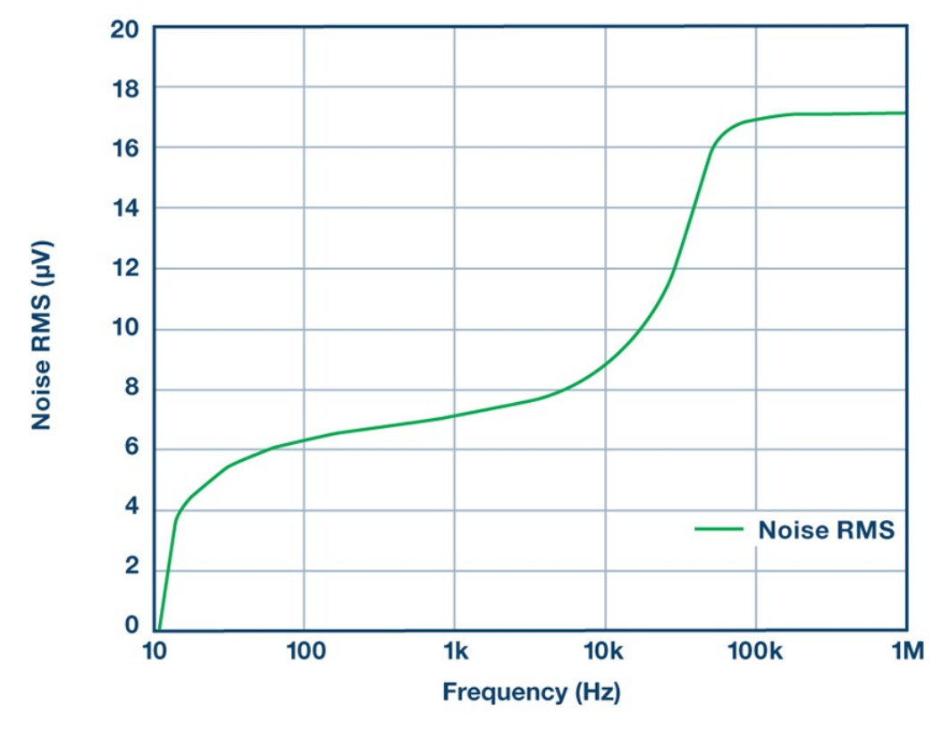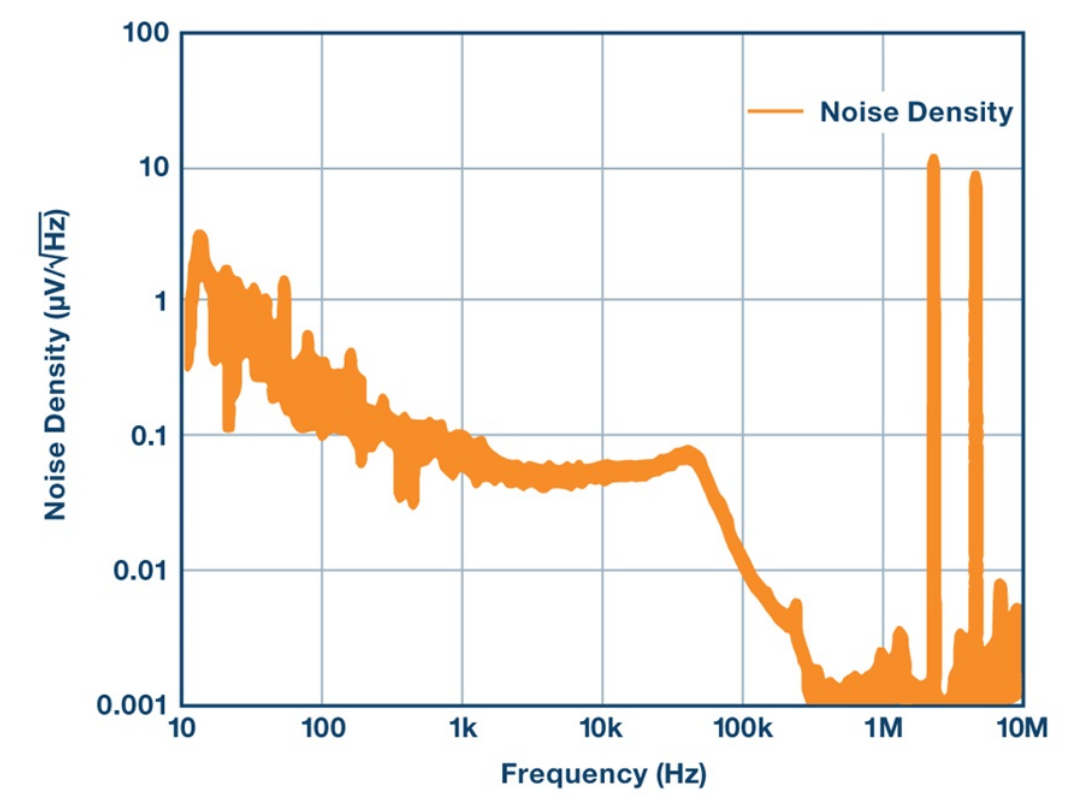 开关稳压器中的宽带噪声是输出电压上的随机幅度噪声。它可以用整个频率范围内的噪声密度来表示,单位为 V/√Hz z,或用Vrms来表示,其与频率范围内的密度不可分。由于硅工艺和基准电压源滤波器设计的限制,宽带噪声主要位于开关稳压器的10Hz至1MHz频率范围内,在低频范围内很难通过增加滤波器来将其降低。