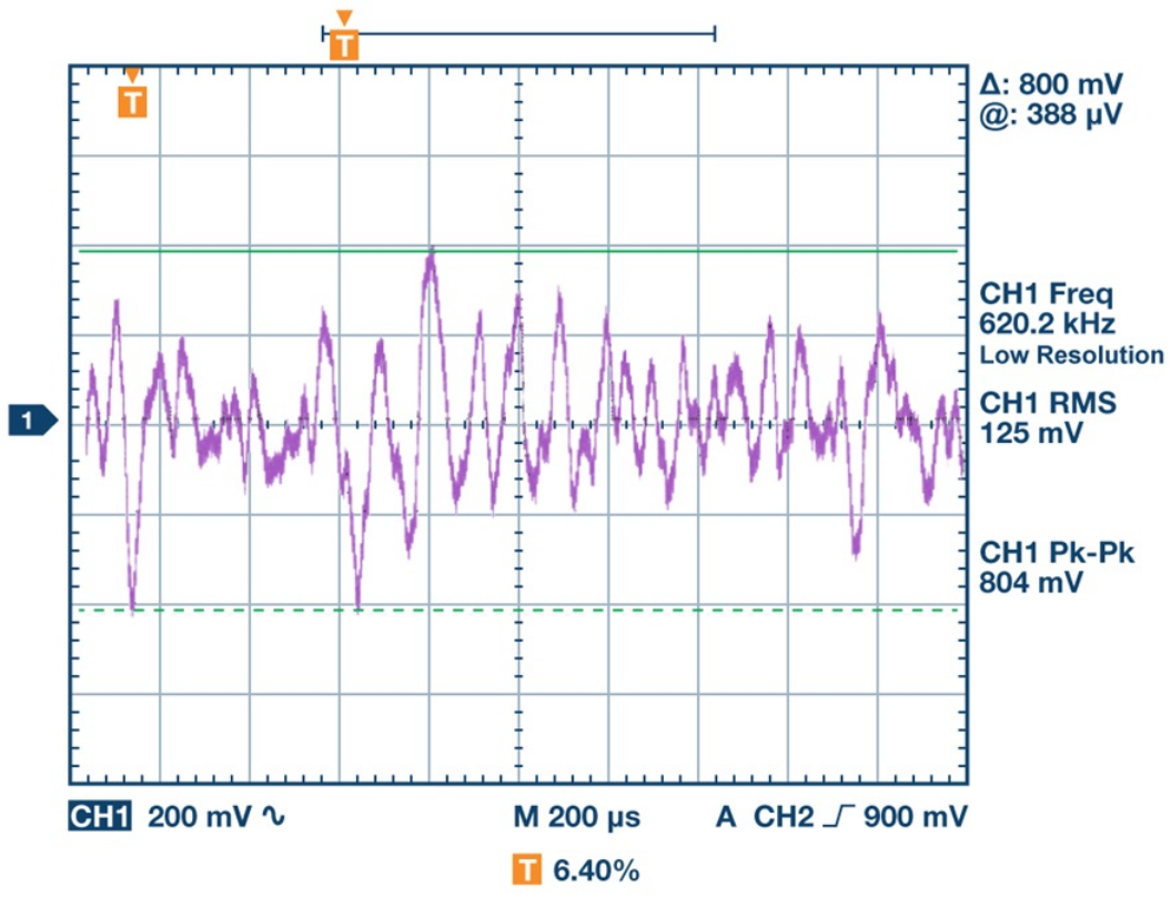典型降压稳压器宽带噪声峰峰值幅度电压约为100μV至1000μV,远低于开关纹波噪声。如果使用额外的滤波器来降低开关纹波噪声,则宽带噪声可能成为开关稳压器输出电压的主要噪声。图4显示了当没有额外滤波器时,降压稳压器输出噪声的主要来源是开关纹波。图5显示了当使用额外滤波器时,输出噪声的主要来源是宽带噪声。