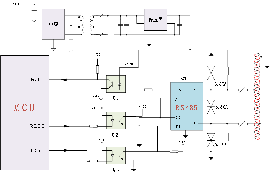 图3为RS-485接口芯片在智能电表方案中的应用示意图。MCU和RS-485采用隔离供电,通过光耦或者数字隔离器实现主回路和RS-485之间的隔离。RS-485产品外围采用TVS/TSS和热敏进行防护。