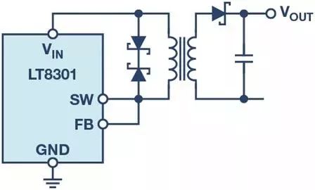 对于许多应用而言,±10%至±15%的调节精度已经足够。图1所示为LT8301,由于集成了电源开关,并采用SOT23封装,IC仅需很少的外部元件,电路的隔离击穿电压仅取决于所用变压器,因此可提供极大的灵活性,尤其是在要求非常高的隔离电压时。