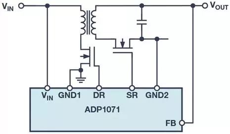 不过,对于需要更高输出电压控制精度的应用,还有另一个有趣的解决方案——ADI面向市场推出的反激式控制器ADP1071,它包含一个采用iCoupler®技术的完全集成式反馈路径,图2显示了其仅需极少数量无源元件的电路。