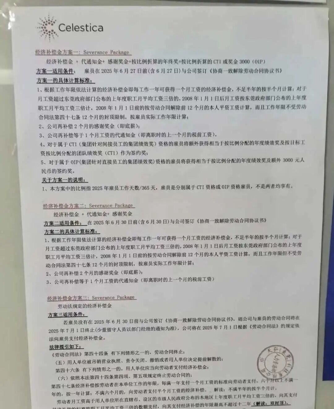 东莞天弘承诺依法支付经济补偿金,赔偿金额分三种:若员工在6月27日前签约,可获“经济补偿金+代通知金+感谢奖金+年终奖折算”;6月30日前签约则补偿减少;逾期则按劳动法最低标准支付。