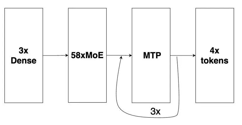 DeepSeek-R1 的基础主模型包含:3 个密集层(初始)和 58 个 MoE 层,此外还有 1 个多 token 预测 (Multi-Tokens Prediction, MTP) 层(相当于 MoE 架构)用于推测性解码。我们的优化配置将 MTP 层扩展成 3 个层,采用自回归方法探索其最大性能。