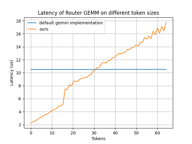 我们通过使用内部的 AI 代码生成器,自动生成经过优化的 RouterGEMM 内核。在 num_tokens ≤ 30 时,该内核性能较默认的 GEMM 实现有显著提升。