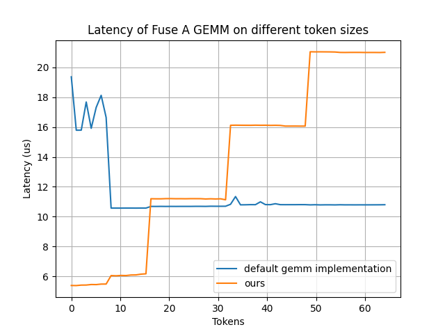 我们开发了一个定制的 Fuse_A_GEMM,通过将大部分权重预先载入到共享显存(通过 PDL 实现并与 oneshot-AllReduce 重叠),大幅提升了性能。当 num_tokens < 16 时,该内核性能较默认的 GEMM 实现有明显提升。