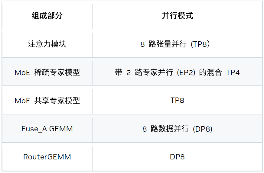 我们还在 8 个 Blackwell GPU 上尝试并引入了混合并行策略。具体而言,该延迟场景的最佳策略为 “TP8EP2”,其定义如下: