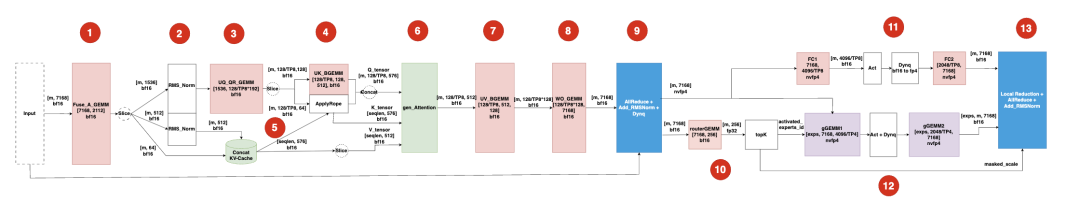 - 模块 9:融合内核将 oneshotAllReduce、Add_RMSNorm 和 DynamicQuant (BF16->NVFP4) 整合到单个内核中。