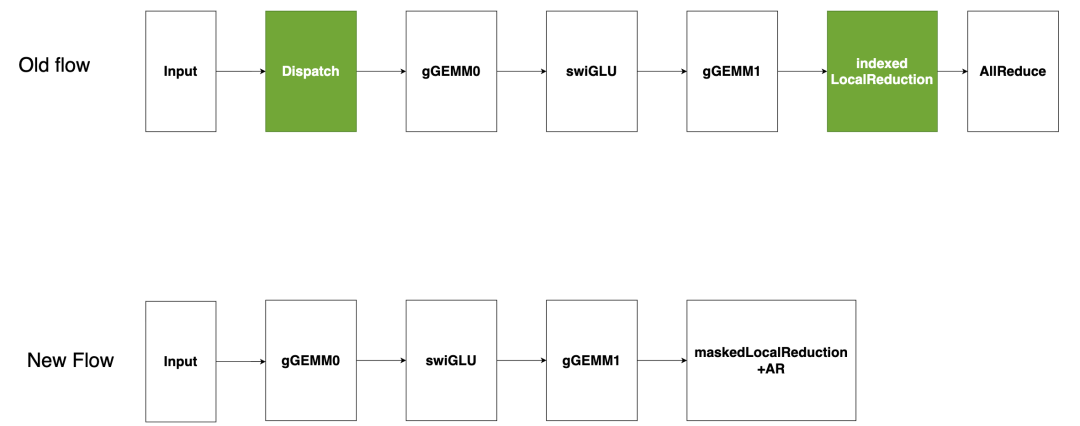 现有的基于 CUTLASS 的稀疏专家模型流(如图所示)将输入的 token 分发到指定的专家模型,然后在每个专家模型的输出上进行索引式的局部归约,最后进行全局 AllReduce。分发和索引局部归约在低延迟场景下会产生高开销。为解决此问题,我们提出将“稀疏专家模型作为 GEMM”处理,即将所有 token 发送至每个激活的专家模型,并在局部归约前屏蔽不需要的输出。由于分组 GEMM 受显存限制,冗余 token 产生的额外计算开销几乎没有影响,有效避免了昂贵的分发,同时减少开销。