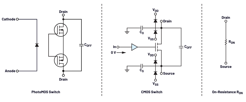 对于PhotoMOS开关,COFF位于漏极输出引脚之间。此外,PhotoMOS开关具有输入到输出电容(也称为漏极电容),同时在其用于导通和关断输出MOSFET的发光二极管(LED)级也存在输入电容。
