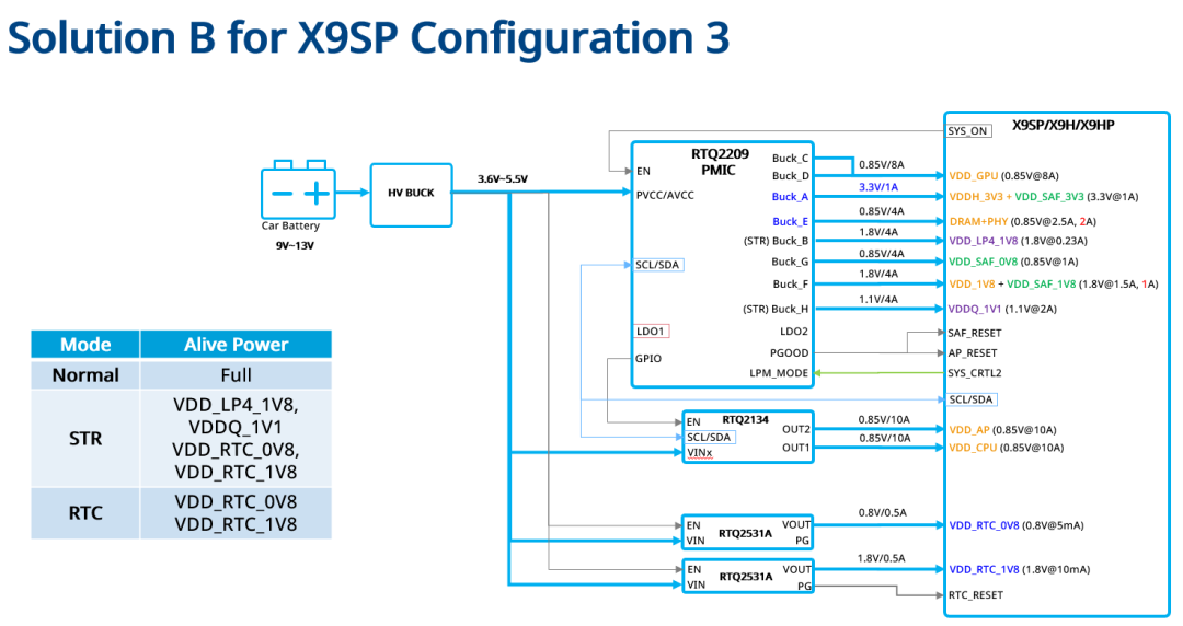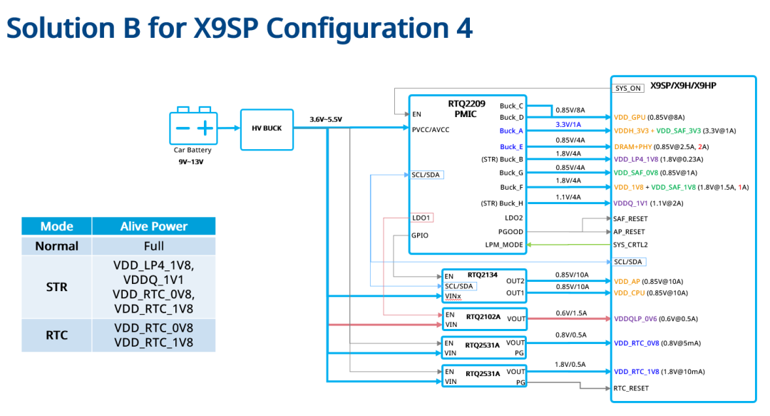 针对座舱系统多样化配置需求,立锜科技提供4套电源配置方案来适配X9SP/X9HP/X9H等SoC。这些方案充分发挥了RTQ2209高度集成化的优势:线路简洁,节省空间,操作便捷,完美满足座舱系统极简、高效的需求。