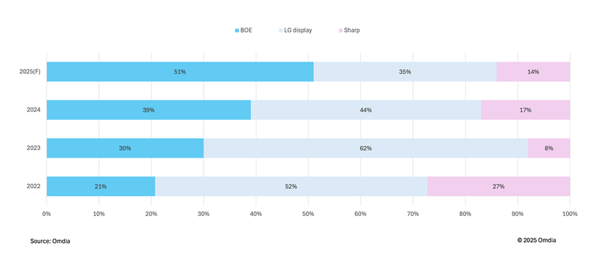 Omdia最新预测,BOE在2025年MacBook面板供应中的预期份额为51%,较去年同期增长12%。