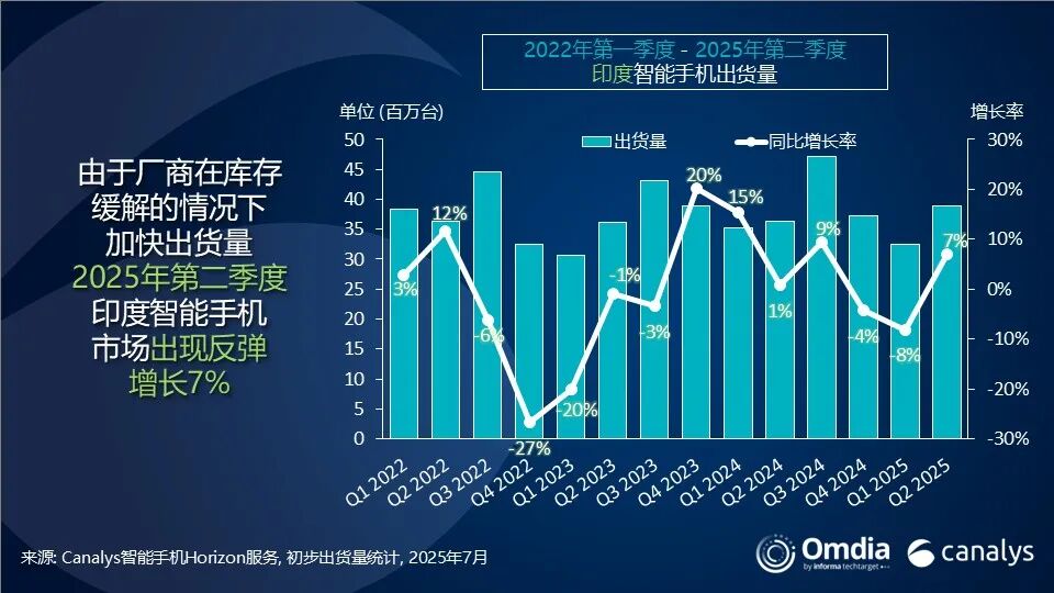 Chaurasia继续表示:“在自然需求有限的情况下,2025年下半年印度智能手机市场的表现将更多依赖于渠道执行,而非产品发布。各大品牌正积极通过渠道激励计划,与分销商和零售商提前锁定库存,为即将到来的印度节日季做准备。这些激励措施包括高价值奖项——从出国旅游到汽车奖励——这与雨季促销、杜尔加普贺节(Durga Puja)和排灯节(Diwali)等节庆季的销售表现挂钩。零售基础设施升级也在加速推进,体现在展台设置优化、货架陈列更有结构性,以及对促销员参与度和门店执行力提出更严格的季度考核目标。与此同时,品牌也在大力推动高端机型的可负担性,扩大长期分期付款方案,尤其针对中高端产品。尽管这些举措有望增强渠道信心并推动短期出货,但Canalys(现并入Omdia)预计,由于结构性需求挑战仍在,印度市场 2025全年出货量将出现小幅下滑。”