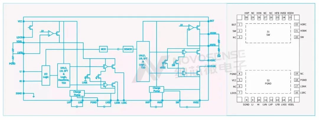 纳芯微NSD2622N是一款QFN 5X7的高压半桥GaN HEMT驱动器,其功能框图和管脚定义如图2和图3所示。该芯片采用了成熟的电容隔离技术,可以满足高压应用要求。其高低边均集成了专用的正负电压调节器,其中正压为5V~6.5V可调,负压为固定的-2.5V,为GaN HEMT提供可靠的负压关断;该芯片具有传输延时短、驱动电流大(峰值电流分别为2A/-4A)等特点,可以满足不同系统的应用要求;同时还具有欠压保护、过温保护和死区互锁等功能,其中死区互锁功能可以有效防止桥臂的上下管直通。此外,该驱动器还提供一路5V的LDO输出,为系统设计提供更多的便捷性。