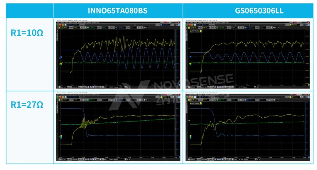 我们采用框图4所示的双脉冲电路对不同驱动电阻下GaN HEMT的栅极波形进行测试验证。其中NSD2622N驱动回路的参考地和GaN HEMT开尔文脚连接,开通时栅极驱动环路总的寄生电感约为38nH,根据 GaN HEMT的规格书CISS计算得到开通时的等效电阻RG(eq)应不小于26Ω。为了直接观察欠阻尼对驱动的影响,R1分别采用10Ω和27Ω进行了对比验证,测试波形如下表1所示,其中蓝色为GaN HEMT的漏极波形,绿色为电感LM的电流,黄色为GaN HEMT的栅极波形。