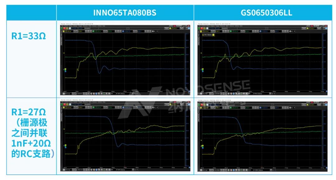 从表1中的波形可以看到, R1为10ohm时,开通驱动回路工作在欠阻尼模式,总线电压50V左右时,两款GaN HEMT的栅极和漏极电压均出现高频振荡,系统无法正常工作;R1为27ohm时,400V电压下,两款GaN HEMT均能正常工作,但INNO65TA080BS在开通过程中,栅极电压出现较为严重的高频振荡。究其原因,主要是由于两款GaN HEMT内部源极的寄生电感和开通时的di/dt存在一定的差异,这种差异导致栅极高频振铃明显不同。为了减小这种振荡,进一步增加驱动电阻R1到33ohm或在栅源极之间并联RC(20ohm+1nF)支路,降低GaN HEMT的开通速度,减小开通时的di/dt,相应的开通关断波形见表2和表3。