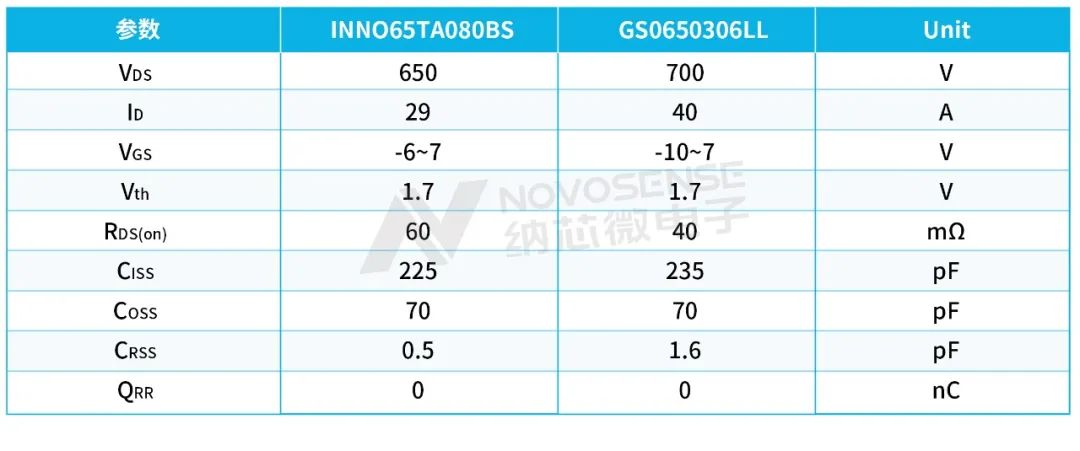 试验中采用了两款具有开尔文引脚的TOLL封装高压GaN HEMT进行验证,型号分别为INNO65TA080BS和GS0650306LL,对应的主要参数如下表所示。