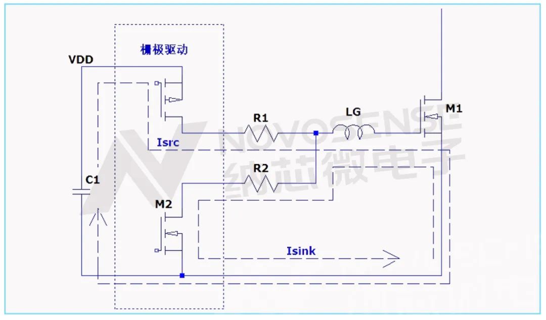 从图1可以看到,开通和关断时的电流路径ISRC和Isink有所不同,对应的开通和关断时总的等效寄生电感LG和等效电阻RG(eq)会有所差异。其中开通时总的等效寄生电感LG包含了的电源部分的寄生电感,而关断时LG则不包含电源部分的寄生电感,分析计算时要注意。