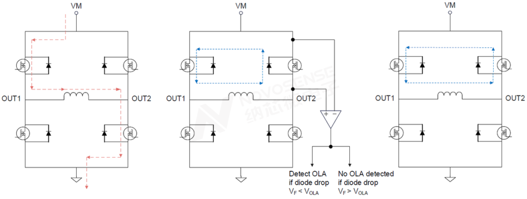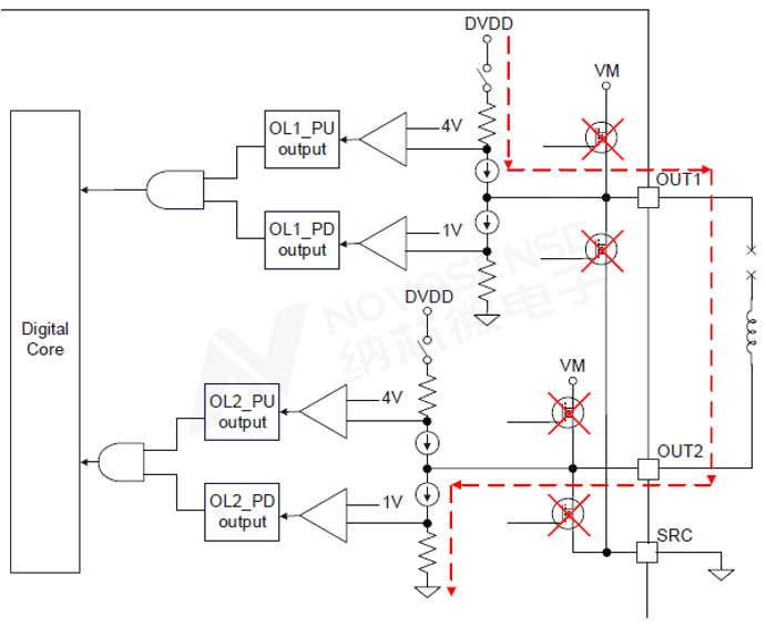 NSD7315支持输出端负载开路诊断功能,可在驱动芯片待机模式和工作模式下分别检测负载状态,帮助系统在电机运转前或运行中及时发现异常,提升系统可靠性。该功能支持两种检测模式:待机模式检测(OLP)和工作模式检测(OLA)。
