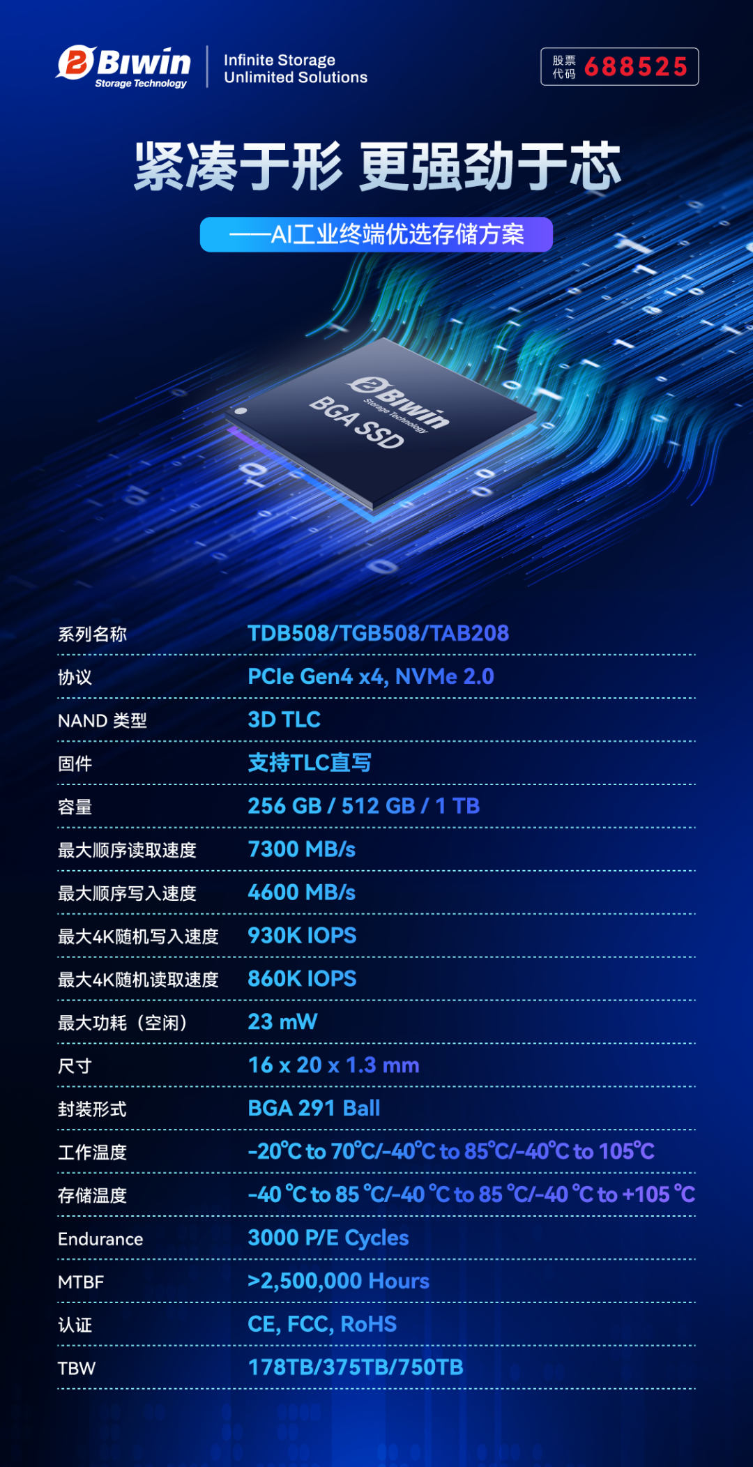 顺应边缘AI对高性能计算、高集成、与微型化的趋势,佰维存储推出工业级BGA SSD,在如五角硬币大小(16 x 20 x 1.3 mm)的尺寸内,提供高达1TB的存储容量与PCIe 4.0 x4的高速传输。BGA封装形式使该产品在需要频繁移动或受到机械振动的设备中更加可靠,广泛适配边缘计算、AI智能盒子、智能工控、智能汽车、通信设备、工业平板、娱乐设备等领域。