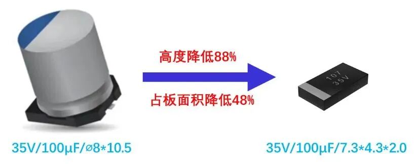 固态聚合物钽电容使用导电聚合物作为电解质,相比液态电解质,其结构更紧凑,可填充到钽粉的细微孔隙中,减少空隙。此外,固态电解质无需预留膨胀空间,封装体积利用率更高,间接提升单位体积的容量,使得电容尺寸得以减小。