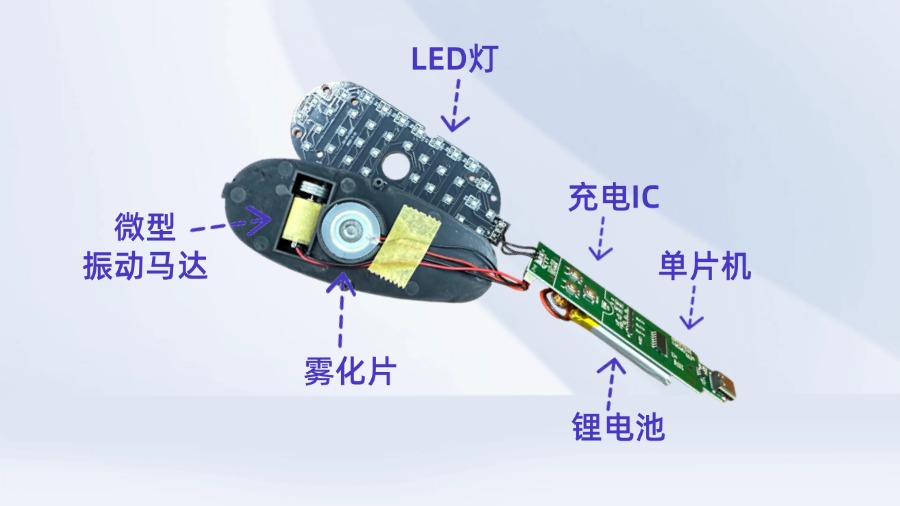 ①单片机核心:低功耗MCU处理按键信号,协调振动、灯光、雾化等功能