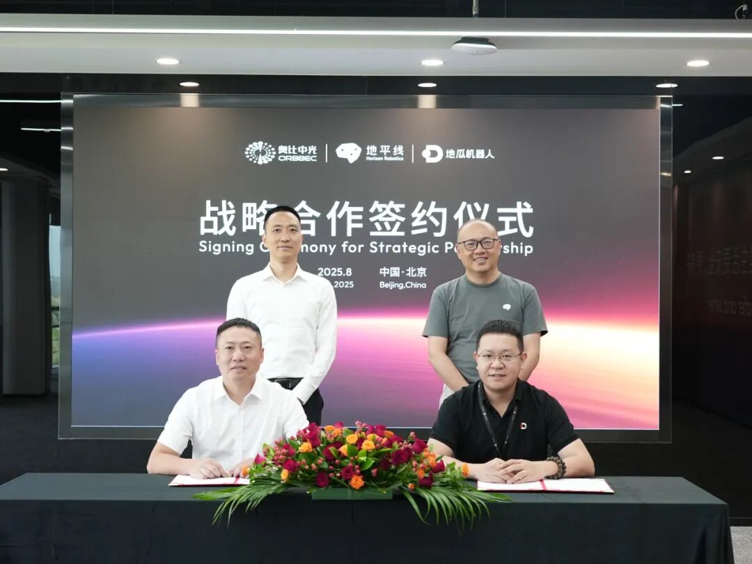 8月11日,奥比中光与地平线及其控股子公司地瓜机器人在北京签订合作协议,双方将在机器人智能化领域展开深度合作,充分发挥各自的技术与产品优势,携手推动机器人产业的技术创新与落地应用。奥比中光创始人、董事长兼CEO黄源浩与地平线创始人兼CEO余凯共同出席见证签约仪式;奥比中光机器人产品线总经理王成、地瓜机器人CEO王丛代表双方签署协议。