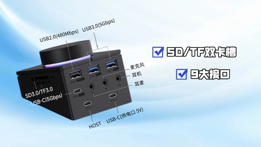 方案集合了主控芯片、专用IC、USB音频IC、旋钮交互与4颗快捷键,支持9个接口(1个UAB2.0、2个USB3.0、1个UAB-C、1个UAB-C供电口、1个Host主机口、1个耳机口、1个耳麦口、1个耳机口),以及SD/TF双卡槽,确保多设备兼容与稳定传输。