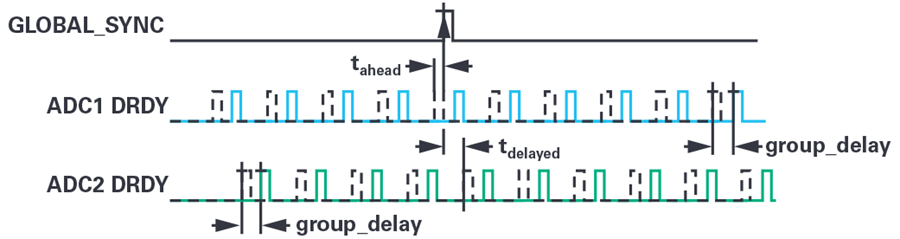 控制器计算采样时刻(通过了解群延迟从数据就绪信号向后计算,如图8所示)和Global_SYNC脉冲之间的时间差。群延迟是一份数据手册规范,说明从对输入采样到数据就绪引脚开启(表示样本已经就绪,可以读取)之间的时间间隔。