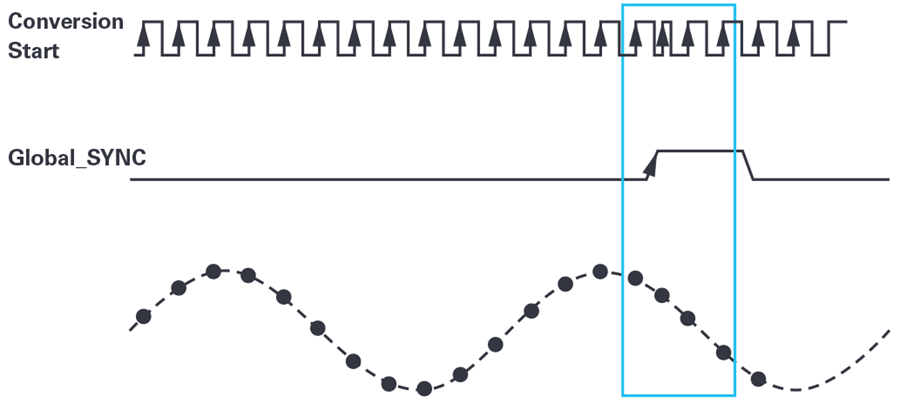 关键分布式系统需要所有子系统同步进行转换,且具备持续的数据流。SAR转换器提供一种直观的重新同步采样方法:通过重新调整转换开始信号,使其与Global_SYNC脉冲匹配。