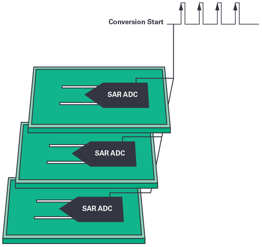 一方面,SAR ADC的输入信号采样时刻通过施加于转换开始引脚的外部脉冲进行控制。如图2所示,将一个通用转换开始信号应用到被同步系统中每个SAR ADC上,它们都会在转换起始信号的边缘同时触发采样。只要确保信号之间没有明显的延迟,即转换开始脉冲在同一时刻及时到达每个SAR ADC,系统同步就很容易实现。注意,到达转换开始引脚的脉冲与实际采样时刻之间的传播延迟不能因设备而不同,在采样速度相对较慢的精密 ADC中,这种延迟不显著。