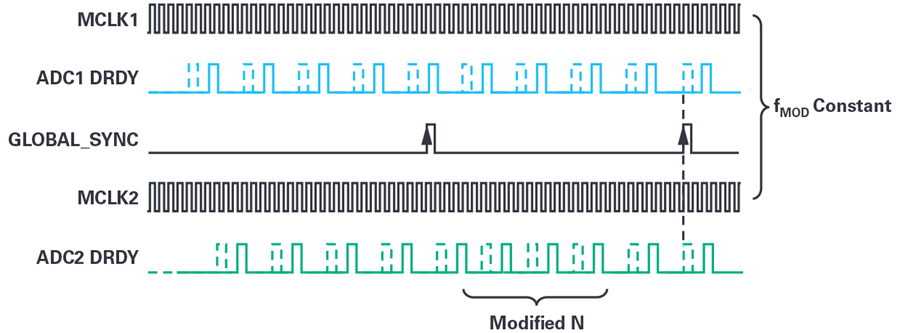图5显示在所有∑-∆ ADC都采用相同的ODR和fMOD的情况下,对同步产生的影响。