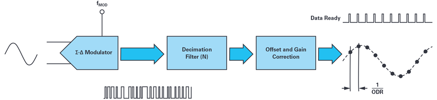 平均过程通常由一个sinc滤波器在内部实现,调制器的模拟转换开始脉冲也在内部生成,因此不会从外部管控转换过程触发。这种类型的转换器实际会连续采样,跟踪输入信号,并处理获得的数据。一旦该过程(采样和平均)完成,转换器就会生成一个数据就绪信号,告知控制器数据可以通过数字接口回读。如图4所示,∑-∆的工作流程可以概括为四个主要步骤:
