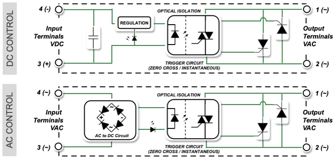 内部等效电路图如下,第一张图可以看出直流信号直接驱动光耦,从而控制可控硅开通,由于负载是交流,如果驱动信号消失,可控硅在负载电压过零时关断,等待下一个驱动信号重新开启,如果直流驱动信号一直在的话,那可控硅可以一直导通带载,因此驱动信号的改变可以直接调整输出功率与频率。