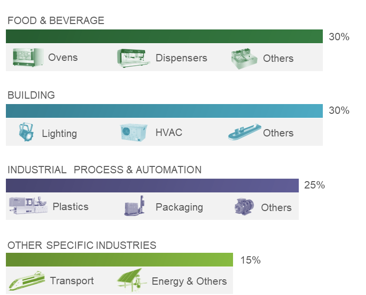 固态继电器相对而言比较简单,作为一个交流控制电路,主要功能为电机控制以及加热调控,涵盖有食物、饮料、建筑、工业自动化、交通与储能等,具体应用为温箱、塑料包装、工业打印机、暖通空调、烤箱、咖啡机等。