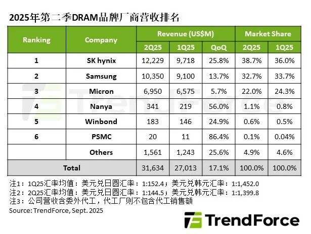 TrendForce集邦咨询表示,2025年第二季DRAM产业因一般型DRAM (Conventional DRAM)合约价上涨、出货量显著增长,加上HBM出货规模扩张,整体营收为316.3亿美元,季增17.1%。平均销售单价(ASP)随着PC OEM、智能手机、CSP业者的采购动能增温,加速DRAM原厂库存去化,多数产品的合约价也因此止跌翻涨。