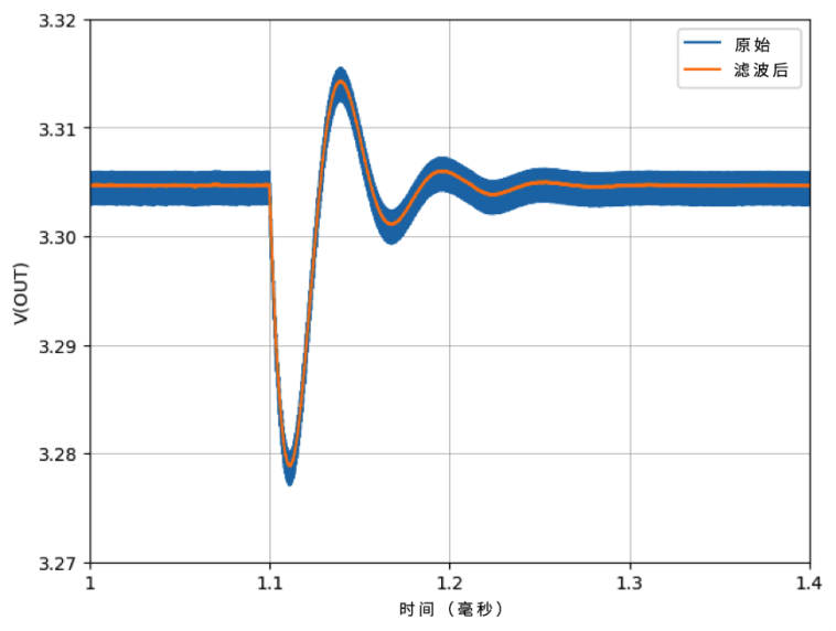 由于这是一个开关电源,其输出电压波形将显示出开关纹波;这使得我们更难以聚焦于核心振铃波形。为解决这一问题,我们使用移动平均滤波器对原始输出电压波形进行滤波。图11展示了仿真#3-1原始和滤波后的时域响应波形。