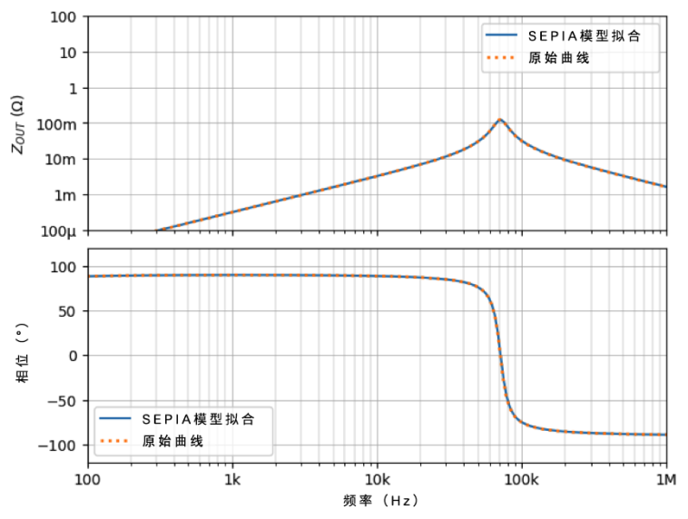 同样地,在频域中观察输出阻抗时,我们可以看到SEPIA模块输出的曲线与原始模型曲线完全一致。