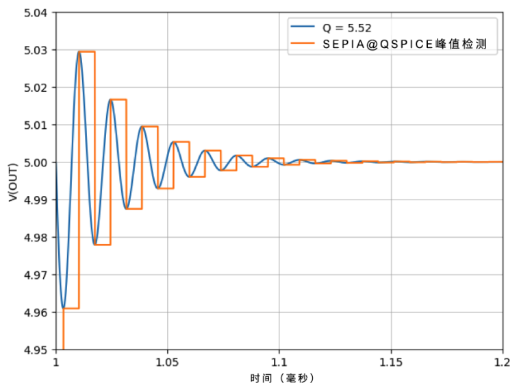 仿真运行时,我们SEPIA@QSPICE模块的灰盒监视器会实时检测每个振铃峰值和谷值。此输出如图4中的橙色曲线所示,为使用SEPIA程序分析衰减特性提供了时间与幅度数据。